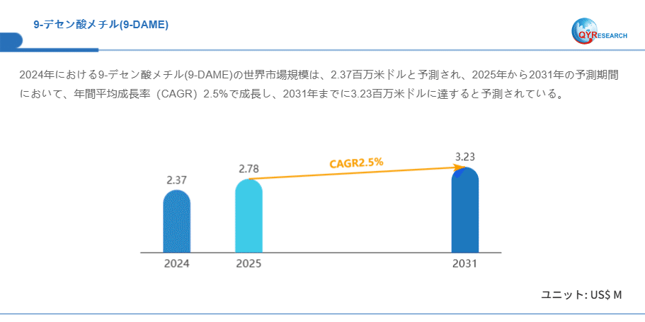 9-デセン酸メチル(9-DAME)の世界調査レポート:2031年には3.23百万米ドルに達する見込み
