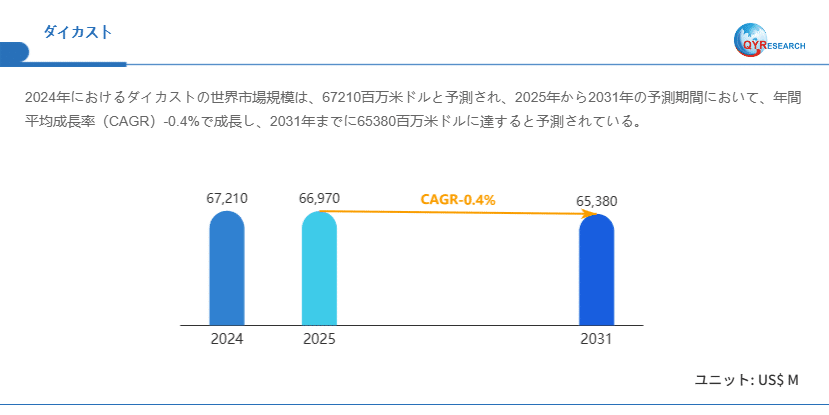 QYResearch株式会社(東京都中央区)は、「ダイカスト―グローバル市場シェアとランキング、全体の売上と需要予測、2025~2031」に関する最新レポートを発行しました。 無料サンプル https://www.qyresearc…