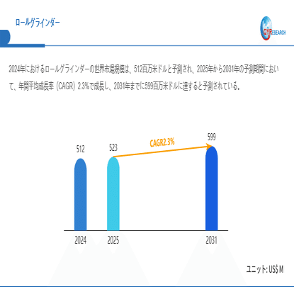ロールグラインダーの世界市場規模は2025年から2031年にかけて年平均成長率(CAGR)2.3%で拡大し、2031年には599百万米ドル規模に達する見込みです。市場は2024年に512百万米ドルと推定され、2025年には523百万米ドルに達すると予測されています。