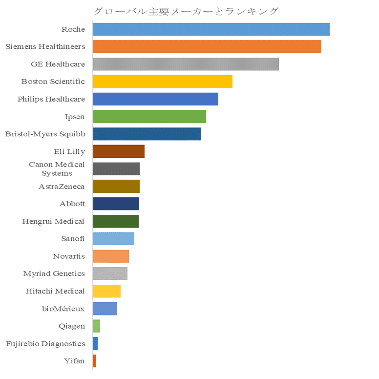 膵臓がん領域の産業構造は、診断・治療双方の技術を統合する総合的エコシステムの形成が進んでいる。市場を主導するのはRocheであり、分子診断とバイオ医薬の両面で圧倒的な研究開発力を持つ。これにSiemens Healthineers、GE Healthcare、Boston Scientific、Philips Healthcareが続き、画像診断装置と治療支援技術を軸に臨床現場への統合を進めている。製薬分野ではIpsen、Bristol-Myers Squibb、Eli Lilly、AstraZenecaなどが治療薬開発を主導し、特に免疫療法や分子標的治療の臨床応用で競争が活発化している。また、Canon Medical SystemsやHitachi Medicalなど日本企業も画像診断領域で高い信頼を得ており、国内医療機関との連携強化を通じて優位性を維持している。さらにbioMérieux、Qiagen、Fujirebio Diagnosticsといった分子診断系企業が参入し、早期検出・再発モニタリング市場を拡大している。このように、膵臓がん診断・治療市場は国際的企業連携と技術多様化を背景に、診断から治療、さらには患者予後管理までを包括する統合型ビジネスモデルへと進化している。