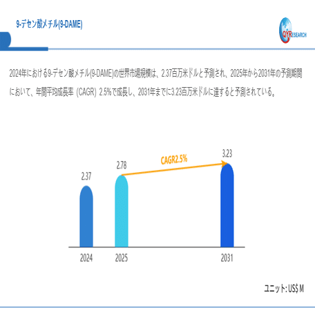 9-デセン酸メチル(9-DAME)の世界市場規模は2025年から2031年にかけて年平均成長率(CAGR)2.5%で拡大し、2031年には3.23百万米ドル規模に達する見込みです。市場は2024年に2.37百万米ドルと推定され、2025年には2.78百万米ドルに達すると予測されています。