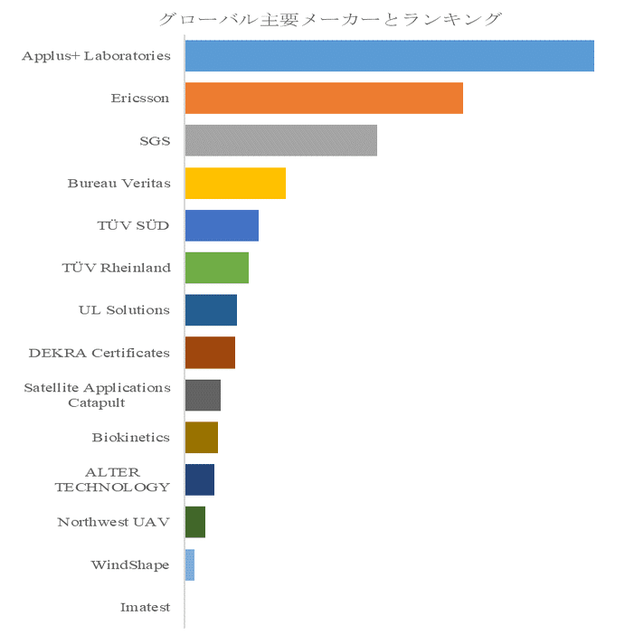 地域別に見ると、北米市場は商用UAVの普及率が高く、軍事・防衛用途の需要も顕著で、Applus+ LaboratoriesやEricssonがリーディングプレイヤーとして強固なシェアを維持している。欧州市場では、SGSやBureau Veritas、TÜV SÜD、TÜV Rheinlandが規制準拠と品質保証を武器に市場を牽引する一方、UL SolutionsやDEKRA Certificatesは産業規格認証や安全評価サービスで差別化を図る。アジア太平洋地域では、UAV導入の新興市場として、物流や農業、インフラ点検向けのテストサービス需要が急速に拡大しており、Satellite Applications Catapult、Biokinetics、ALTER TECHNOLOGYなどの地場・国際企業が市場参入を加速している。企業戦略を見ると、技術力とデータ解析能力を活かしたサービス提供、地域特化型の規制対応、民間・公共分野への横断的サービス展開が競争優位を生む要素である。また、Northwest UAVやWindShape、Inatestなどの新興企業は、シミュレーション環境や自律飛行テストなど先端技術を活用し、革新的な差別化戦略を進めている。