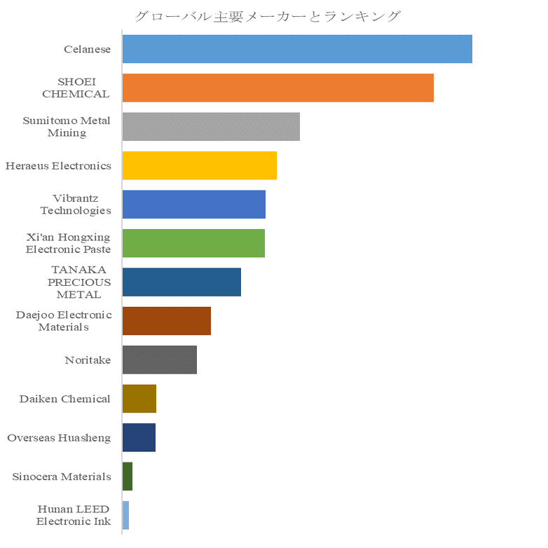 QYResearchのトップ企業研究センターによると、厚膜ペーストの主要製造業者には、Celanese、SHOEI CHEMICAL、Sumitomo Metal Mining、Heraeus Electronics、Vibrantz Technologies、Xi'an Hongxing Electronic Paste、TANAKA PRECIOUS METAL、Daejoo Electronic Materials、Noritake、Daiken Chemicalなどが名を連ねている。2024年時点で世界トップ5企業の市場シェアは約56.0%、トップ10企業では約77.0%とされ、高度な材料配合技術、金属粉末の精製・加工技術、ガラスフリット設計技術、印刷適性制御技術を保有する企業が市場上位を形成している。特にグローバル企業は自動車電子、パワーデバイス用材料、センサ用途など、複数領域への同時供給能力を持つため、顧客側のマルチアプリケーション対応ニーズに応えながら市場支配力を強化している。中国・韓国・日本勢も地域需要の高さを背景にプレゼンスを確立し、グローバル企業との競争・協業の両軸が市場構造を形成している。