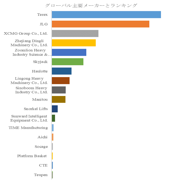 主要メーカーの競争構造を見ると、Terex が圧倒的な首位に立ち、市場で最も強い存在感を示している。同社は広範な製品ラインアップと高いブランド信頼性を備え、特に北米市場で強固な顧客基盤を築いている。JLG がこれに続き、技術革新と安全性能で市場シェアを拡大している。中国勢ではXCMG Group、Zhejiang Dingli、Zoomlion、Lingong Heavy Machinery、Sinoboom、Sunward Intelligent Equipment などが台頭し、価格競争力と迅速な製品開発を武器に世界市場で存在感を高めている。欧州ではHaulotte、Manitou、Snorkel、Aichi、Socage、Platform Basket、CTE などが特化型製品や屋内向け電動モデルで差別化を図る一方、Teupen はランキング最下位であるものの、特殊クローラ式モデルなどニッチ分野で独自のポジションを維持している。地域別にみると、北米は依然として最大市場であり、安全規制強化が需要を安定的に下支えしている。欧州は環境規制と電動化シフトが進む市場であり、ゼロエミッション機の普及を後押ししている。アジア太平洋は最も高い成長率を示しており、中国・東南アジアでは都市建設、物流インフラ開発、再開発プロジェクトの増加が需要を急拡大させている。各地域の需要特性とメーカーの技術戦略が交差し、市場競争はますます複雑に進化している。