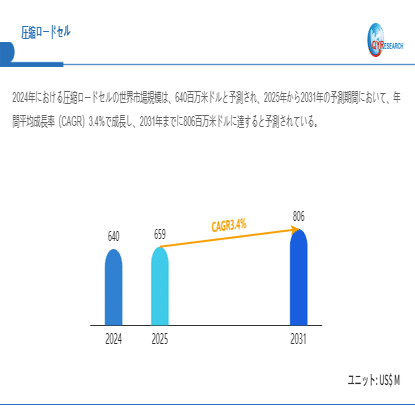 圧縮ロードセルの世界市場規模は2025年から2031年にかけて年平均成長率(CAGR)3.4%で拡大し、2031年には806百万米ドル規模に達する見込みです。市場は2024年に640百万米ドルと推定され、2025年には659百万米ドルに達すると予測されています。