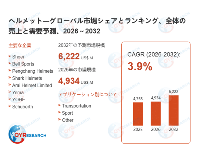 2026年3月25日に、QY Research株式会社(所在地:東京都中央区)は、「ヘルメット―グローバル市場シェアとランキング、全体の売上と需要予測、2026~2032」の最新調査資料を公開しました。本レポートは、ヘルメット市場の規模推移、成長トレンド、競争構造、地域動向、主要企業ランキングを体系的に整理し、市場全体の構造を明確化します。主要企業の市場シェアや競争戦略を軸に、売上、価格動向、需要予測データを分析し、現状把握と将来展望を提示します。2026~2032年の成長見通しを定量・定性の両面から検証し、企業の競争力強化と市場戦略高度化に資する実践的インサイトを提供します。