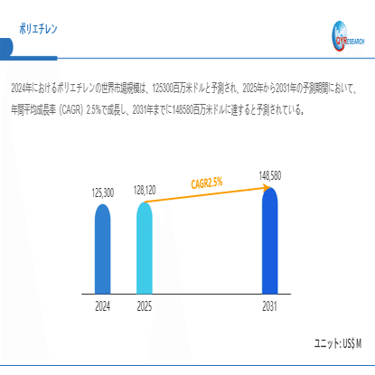 ポリエチレンの世界市場規模は2025年から2031年にかけて年平均成長率(CAGR)2.5%で拡大し、2031年には148580百万米ドル規模に達する見込みです。市場は2024年に125300百万米ドルと推定され、2025年には128120百万米ドルに達すると予測されています。