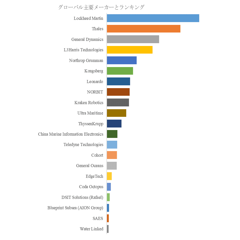QYResearchによれば、グローバルな潜水艦用ソナーの主要な製造業者には、Lockheed Martin、Thales、General Dynamics、L3Harris Technologies、Northrop Grumman、Kongsberg、NORBIT、Leonardo、Kraken Robotics、Ultra Maritime などが含まれる。2024年時点で、これらトップ10企業により世界市場の約62.0%の売上市場シェアを占めていた。これは市場が依然として寡占的であり、技術と信頼性で実績を持つ企業に集中していることを示す。中でも Thales は、50隻以上の潜水艦にソナーを納入する実績を誇り、曳航式可変深度ソナー(VDS)「CAPTAS」シリーズなどで広く知られている。また、Ultra Maritime のように、近年 Surface Fleet 向けのASWソナーで契約を受注する企業も出てきており、潜水艦用に限られない用途拡大の兆しがある。つまり、主要メーカーは既存技術の深化だけでなく、新用途、新プラットフォームへの適用を通じてポートフォリオ拡大を図っている。