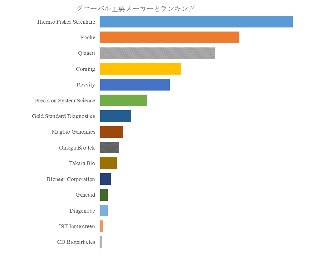 Thermo Fisherは自動化対応キット群で研究・臨床分野をリードし、Rocheは診断用途の核酸抽出ソリューションで高い信頼を得ている。Qiagenはモジュール型キットの拡張性で研究市場をカバーし、CorningとRevvityは装置連携型製品で独自のポジションを築いている。さらに、Precision System ScienceやTakara Bioといった日系企業も、独自の核酸抽出技術やOEM供給で存在感を高めている。競争は激化しながらも、品質・再現性・自動化適合性を軸にした「技術ブランド競争」が業界の持続成長を支えている。