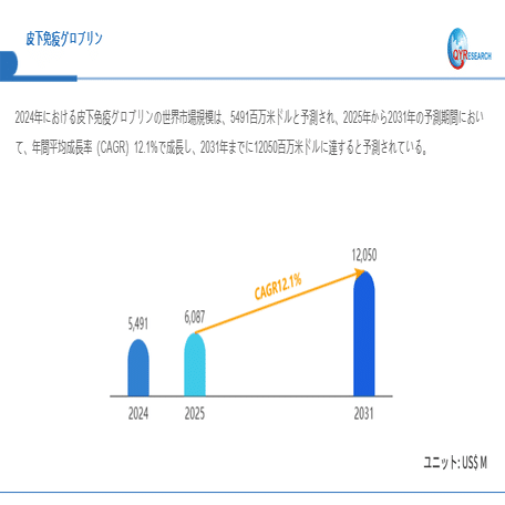 皮下免疫グロブリンの世界市場規模は2025年から2031年にかけて年平均成長率(CAGR)12.1%で拡大し、2031年には12050百万米ドル規模に達する見込みです。市場は2024年に5491百万米ドルと推定され、2025年には6087百万米ドルに達すると予測されています。