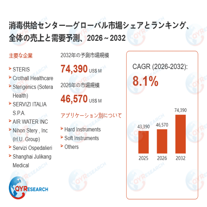 QYResearch調査チームの最新レポートである「2025~2031年グローバル消毒供給センター市場レポート」によると、2025年における消毒供給センターの世界市場規模は、43390百万米ドルと予測され、2026年から2032年の予測期間において、年間平均成長率(CAGR)8.1%で成長し、2032年までに74390百万米ドルに達すると予測されている。